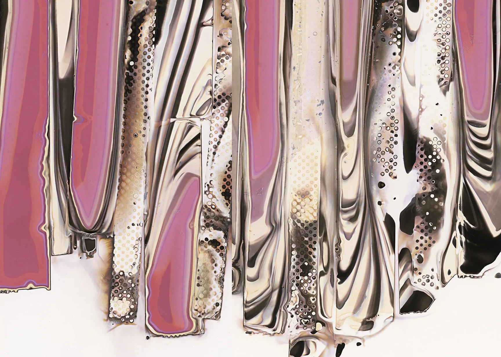 I chose to photograph the chemigrams one instant to the next, making records in an abstract and shifting landscape. My intention paralleled what I consistently aim to do with my work: to chronicle the fleeting process of development. Each moment I photographed is a record of a transformation underway, a split second in a state of flux brought interview within a single frame.