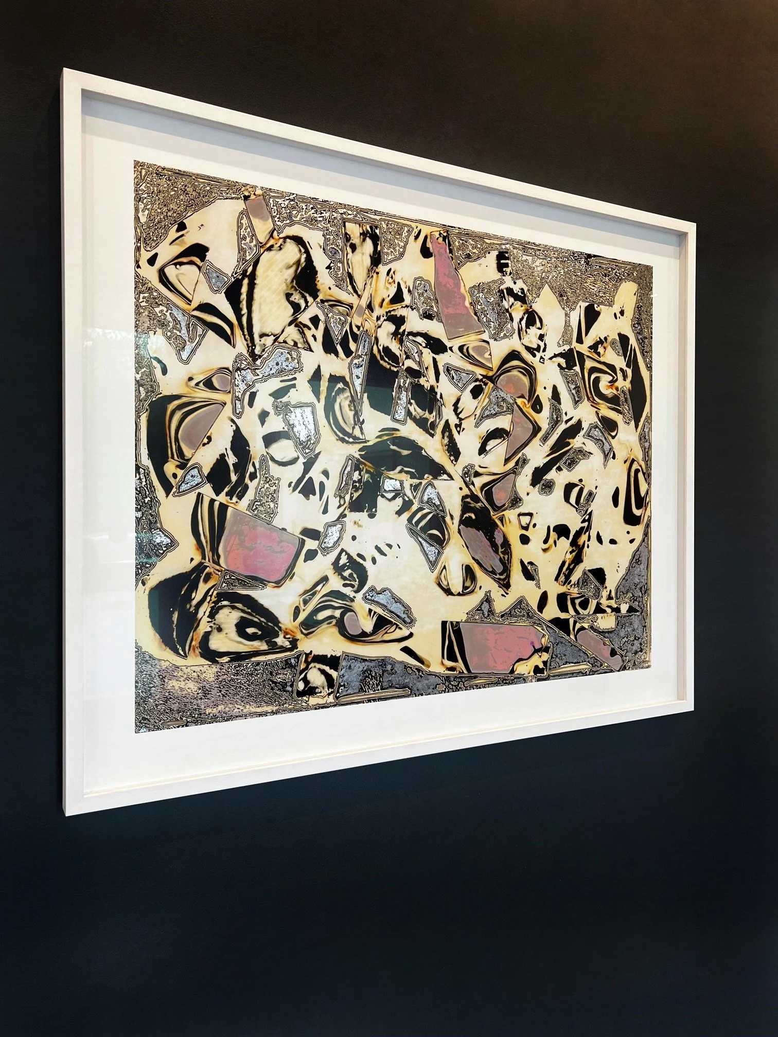 I printed the images adding the silver metallic paint initially meant to block the chemical process from occurring. I use the same reflective material and painted directly onto the final photographic prints. My work is drawn from the in between, the unfolding experience between the knowable and uncertain, it is as brief as it is infinite.”